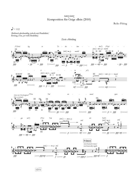 “Tanz.tanz” (dance.dance), for solo violin (2010), was commissioned by Alexandrina Boyanova. The general form of the composition is based on an analysis of Bach’s Chaconne by German musicologist Helga Thoene, to whom the piece is dedicated. The choral tunes that she discovered – which are woven into the texture of this unique conclusion of the D minor Partita – form the original material. Another reference, which is reflected in the title as well, is the novel “Dance Dance Dance” by Haruki Murakami.
