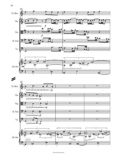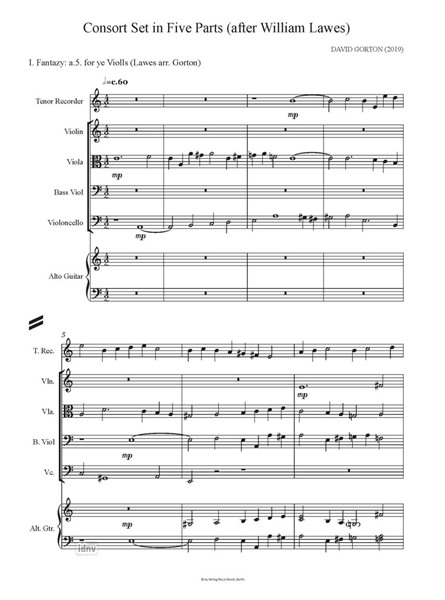 Consort Set in Five Parts für Blockflöte, Violine, Viola, Bassgambe, Violoncello und elfsaitige Altgitarre (2019)(nach William Lawes)