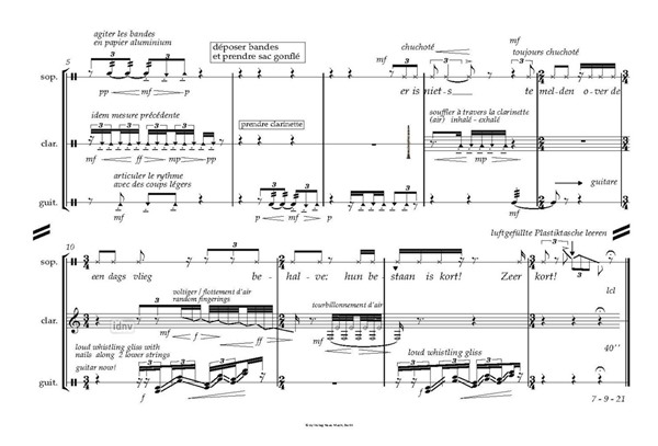 Besetzung Sopran, Klarinette und Gitarre geschrieben. Neben dem Gebrauch von vielen kleinen Handperkussionsinstrumenten wird die Gitarre durch das Banjo, das Balafon, die Bass-Ukelele oder das Erhu ersetzt. Insofern erhält der Zyklus eine ethnologische Komponente, mit abwechslungsreichen Klangfarben, die im Kontrast zur Klangwelt der