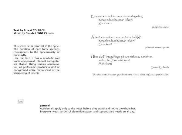 Die vorliegende Komposition ist Teil des Gesamtzyklus Insektenhotel, der aus 25 Stücken mit Textvertonungen in 25 Sprachen besteht. Grundsätzlich sind die Stücke für die Trio-