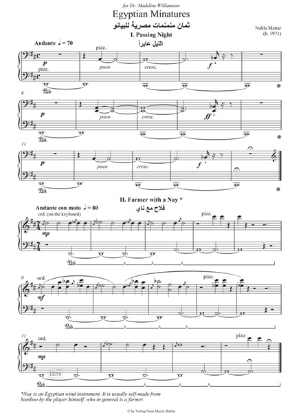 Nahla Mattar erschafft dieses bemerkenswerte musikalische Bildnis durch ein minimalistisches Vokabular (In Death Improvising werden sechs Töne benutzt, in Passing Night nur fünf), wobei im gesamten Werk die Standard-Techniken des Spiels im Inneren des Instruments zur Anwendung kommen. Die einzelnen Sätze erinnern an die frühen Bilder der Fotografen Félix Bonfils, Francis Firth und Maxime Du Camp, deren Erkundungen Ägyptens im 19. Jahrhundert die Mystik eines exotischen Landes, seiner Menschen und seiner Kultur erfahrbar machten. In den Miniaturen erscheinen deutlich unterscheidbare kulturelle Personas (The Workers Song, Farmer With The Nay), deren Klangwelt Traum-ähnlich verarbeitet und geformt wird, so dass der Hörer aus seiner gewohnten Erwartungshaltung geführt wird, auf eine Reise durch Zeit und Raum.