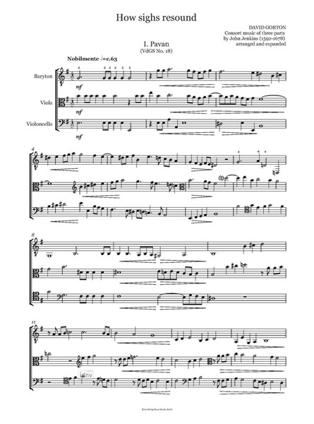 How sighs resound is an arrangement and expansion of selected movements from the consort music of three parts by John Jenkins (1592-1678). Movements I, III, V, and VII are arrangements of fantasias for treble, two basses and organ, Viola da Gamba Society (VdGS)