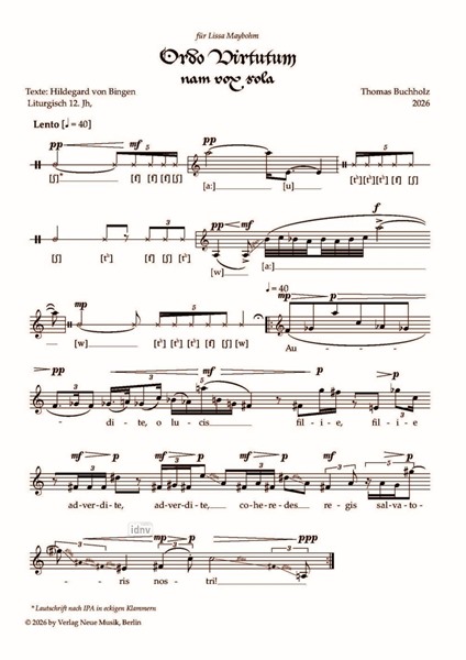 Ordo Virtutum nam vox sola für Stimme allein (Sopran) (2026)Ordnung der KräfteText: Hildegard von Bingen, Liturgisch, 12. Jh.