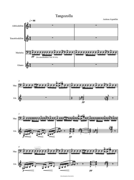 Tangozolla op. 67 Quartett für 2 Blockflöten, Schlagzeug und Gitarrein memoriam Astor Piazzolla